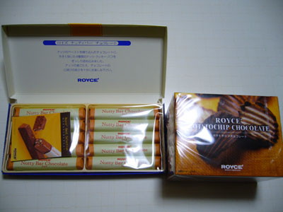 ご存じの方も多いと思うのですがROYCE'社の『ナッティーバーチョコ』(左)と『ポテトチップチョコ』(右)。