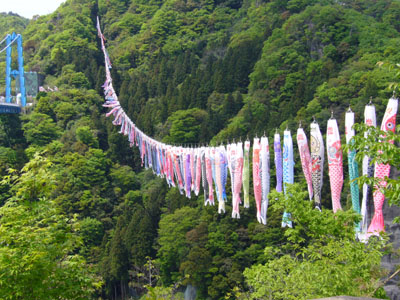 写真はお墓参り後に立ち寄った『竜神峡大橋』に吊るされたこいのぼりの数々です。