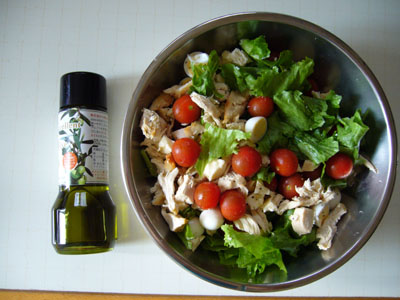 鳥もも肉をトースターで焼いて余分な油抜きしたモノやプロセスチーズ、プチトマト、ウズラの卵などなどを豪快に切ってぶち込んであります 笑。