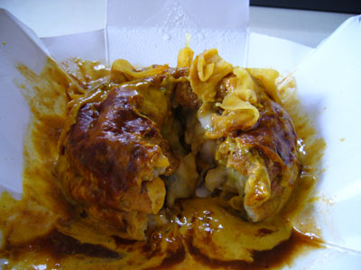 たこ焼きみたいな球体(でも大きさがその3倍くらいあるのかな?)にカレーソースがかかって、