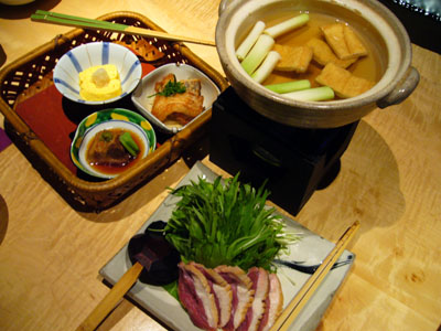 合鴨と水菜の鍋とおばんざいのセット。