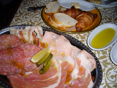 Iちゃん大好物の生ハム盛り合わせと奥が手作りパン。