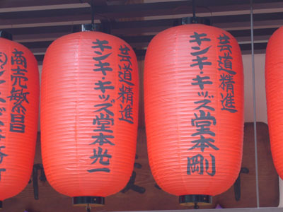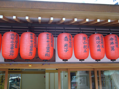 丁度売り場真ん中辺りの屋根のひさし部分になんと2人の提灯が...。