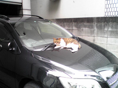 車のボンネットで寛ぐにゃんこを発見。