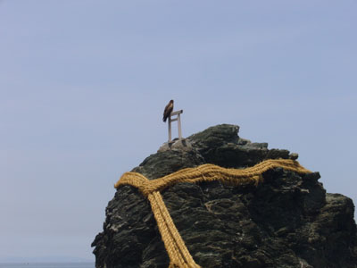 よく見ると夫婦岩の鳥居のところに鷹?鷲?が!!