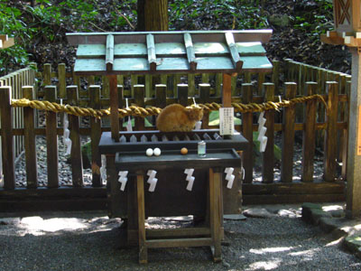 夫婦岩付近にある社の賽銭箱の上に猫が鎮座。