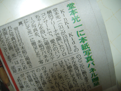 トーチュウさん。 パンちゃんを抱いた写真を パネルにして光一さんに贈呈とな。 まあ、なんとも粋な事をされなさる。 光一さん本人はご自分の顔に不評のようですが、 いやいやどうして、イイ表情で撮れてまっせ。