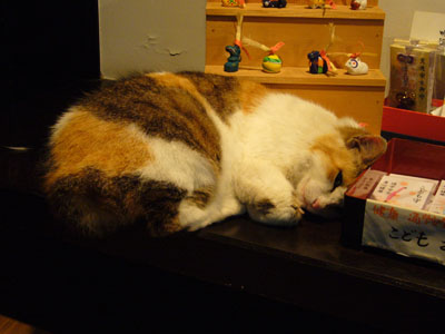 おみくじやお守りが並んでる一角に三毛猫が鎮座。